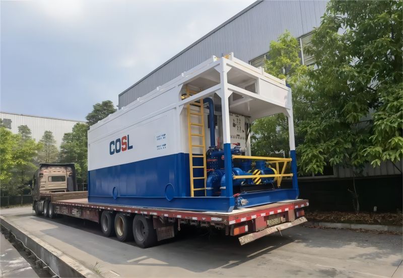 日前,西部石油完成了廣東某客戶訂購的一批固控設備,本批次交付的訂單產品是應用于混配固井作業混合水的一類水罐裝置,該裝置容器柜采用碳鋼材質,撬架為鋼結構。大功率電機驅動離心混合泵以實現罐內混合液體的循環,另外兩臺電機驅動兩臺攪拌器,所有電機均為防爆型。混合水柜的實際工作容積為 30 立方米,整個設備具有 CCS 認證,適用于海洋、沙漠和陸地油田作業環境。